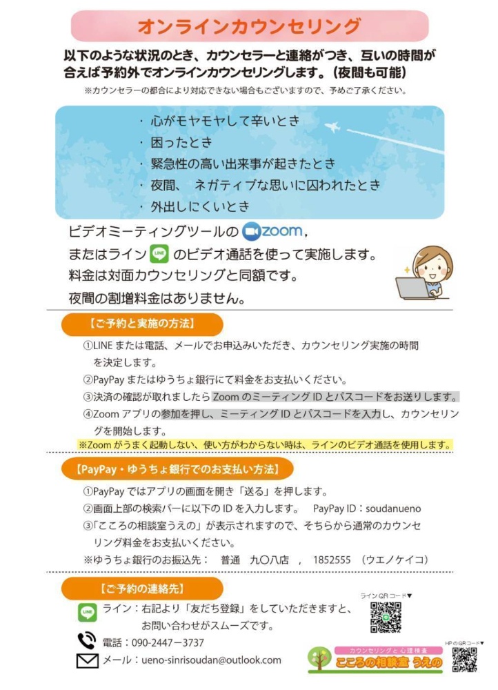 ▶オンラインカウンセリングにも対応しております。Zoomはもちろん、ラインのビデオ通話でも可能で、料金も同じです。